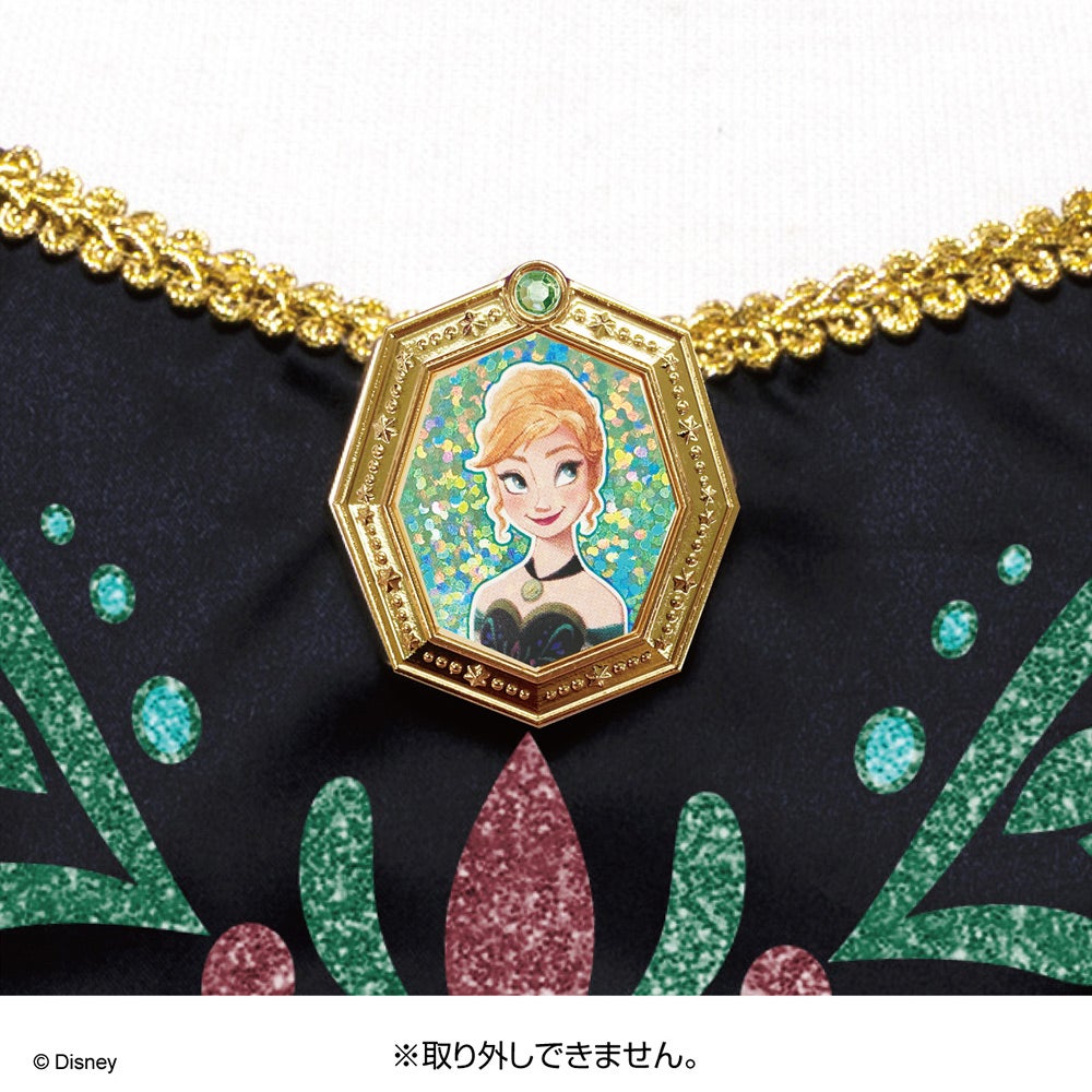 • 胸元はシックな黒にカラフルなプリント、アナのイラスト入りのブローチがポイントに!