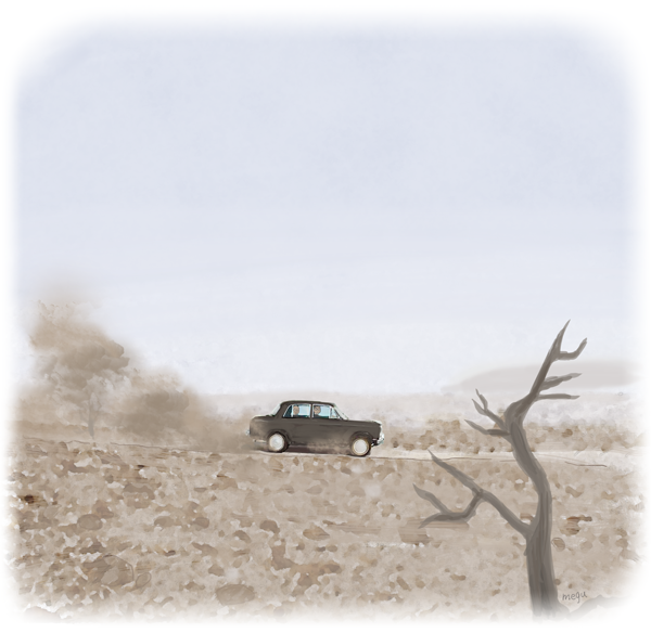 舗装も施されていない県道を、土埃を巻き上げながら走る車の先には、荒涼たる荒野が広がるばかり。その風景を前に、暗澹たる思いが自然と二人を無口にさせたのでした。