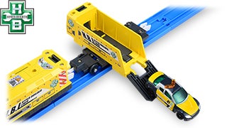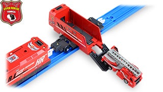 先頭車はトリガーレールを通過すると放水銃が出てきて「消火モード」に自動変形!後尾車にはトミカが搭載可能で、発車遊びができます。3両はそれぞれ切り離しが可能です。