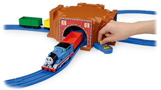 たくさんの貨車をひいたトーマスが、トンネルの4つの穴をいろんな方向から出たり入ったり!