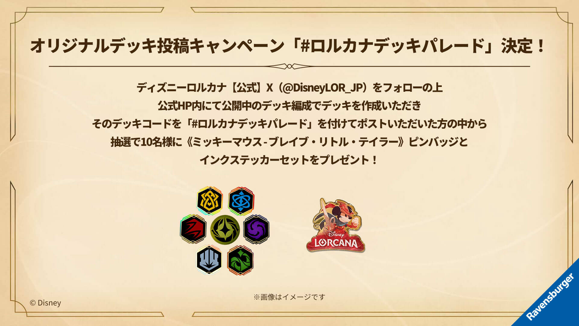「ディズニーロルカナ【公式】 X(@DisneyLOR_JP)」をフォローの上、公式HP内にて公開中のデッキ編成でデッキを作成いただき、そのデッキコードを「#ロルカナデッキパレード」を付けてポストいただいた方の中から抽選で10名様に《ミッキーマウス – ブレイブ・リトル・テイラー》ピンバッジとインクステッカーセットをプレゼント!