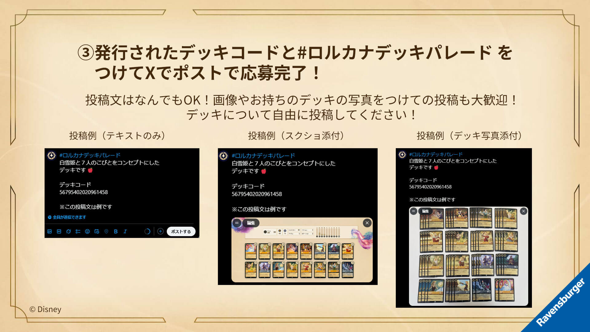 ③完成したデッキでデッキコードを発行。ハッシュタグ「#ロルカナデッキパレード」を付けて、デッキコードと共にXに投稿。