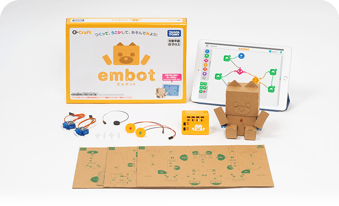 「embotすみっコぐらしをつくろう!ダンボールキット」では、パーツを選んで5つのキャラクターのうちどれか1つを作ることができます。embotスターターキットの電子工作パーツと組み合わせると、プログラミングで動くあなただけのすみっコぐらしキャラクターの完成です!