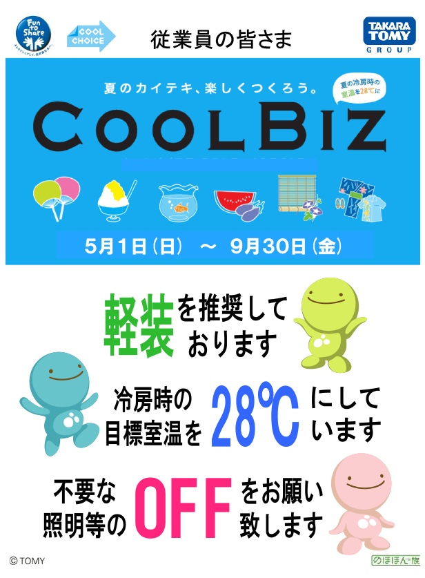 タカラトミーグループは環境省が推進する「COOL CHOICE」に賛同しています。日本が掲げる温室効果ガス排出量の削減目標(2030年度に2013年度比26%削減)を達成するため、省エネ・低炭素型の製品・サービス・行動など、温暖化対策に資するあらゆる「賢い選択」を促す国民運動です。