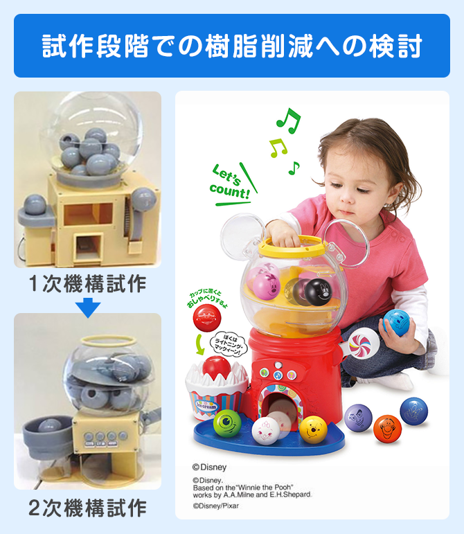 ベビー商品の「はじめて英語 ディズニー&ディズニー・ピクサーキャラクターズ おしゃべりいっぱい!ガチャ」では、ボールの出てくる方法や、音を出す部分の機構を何度も見直すことで、見た目の楽しさや遊びの楽しさを損なうことなく、プラスチックの重量や本体内部のパーツの数を減らすことに成功しました。
