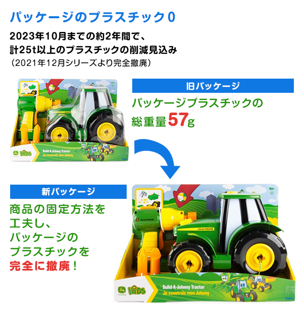 子どもたちが楽しく遊べる要素はそのままに、使用パーツや樹脂の量を減らすことで、省資源の工夫を行っています。