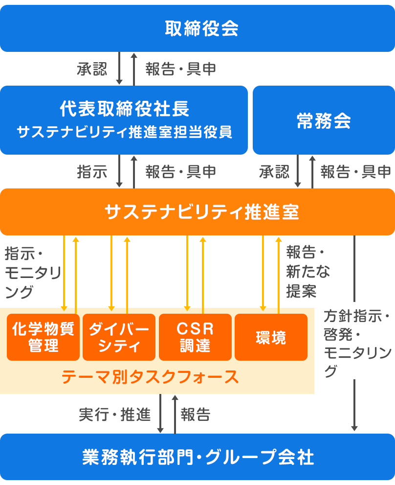 テーマ別タスクフォースの進捗は、年に2回開催するサステナビリティコミッティにて報告され、サステナビリティコミッティでの指示・モニタリングを通じて取組みの強化を図ってまいります。