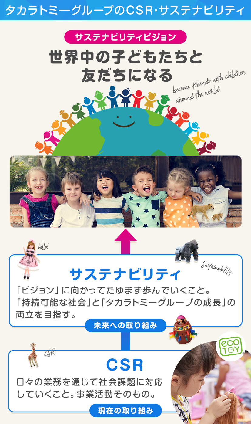 タカラトミーグループではサステナビリティ経営を、これまで以上に積極的に推進するため、 2024年7月より、代表取締役社長の諮問機関として「サステナビリティコミッティ」を設置し、サステナビリティ課題の取組みを実行してまいります 。