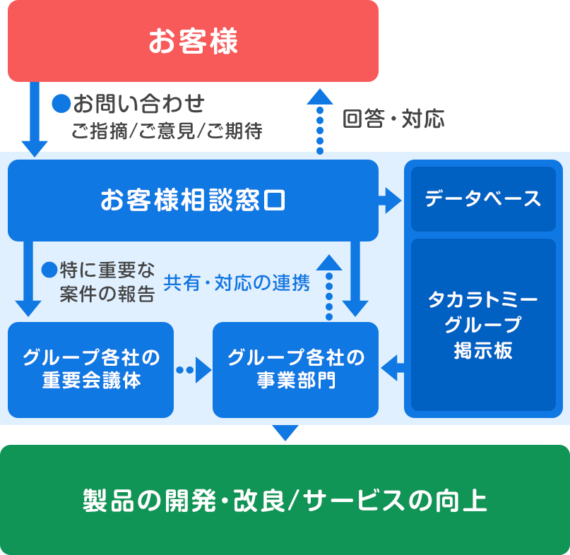 タカラトミーグループのお客様相談室は、電話やメール、WEBチャットでのお問い合わせに応えています。お客様から頂いたお声は、すべて有益で大切な情報としてデータベースに記録し、従業員がアクセスできる掲示板で共有されるとともに、関連する事業部や関係者にすべてフィードバックしています。なかでも、お客様満足に大きく影響を与えるものや、安全・品質に関わる内容は、タカラトミー、タカラトミーアーツ、トミーテック、タカラトミーアイビス等の重要会議体で共有され、早期対応・品質向上等の適切な取り組みがなされる体制になっています。また、万一事故が発生した場合にはタカラトミーの「安全品質統括部」と連携するとともに、タカラトミー代表取締役社長を統括責任者とした危機管理対策本部を設置し、迅速かつ適正な対応を行い、被害を最小限に止めるとともに、再発防止対策を講じるものとしています。