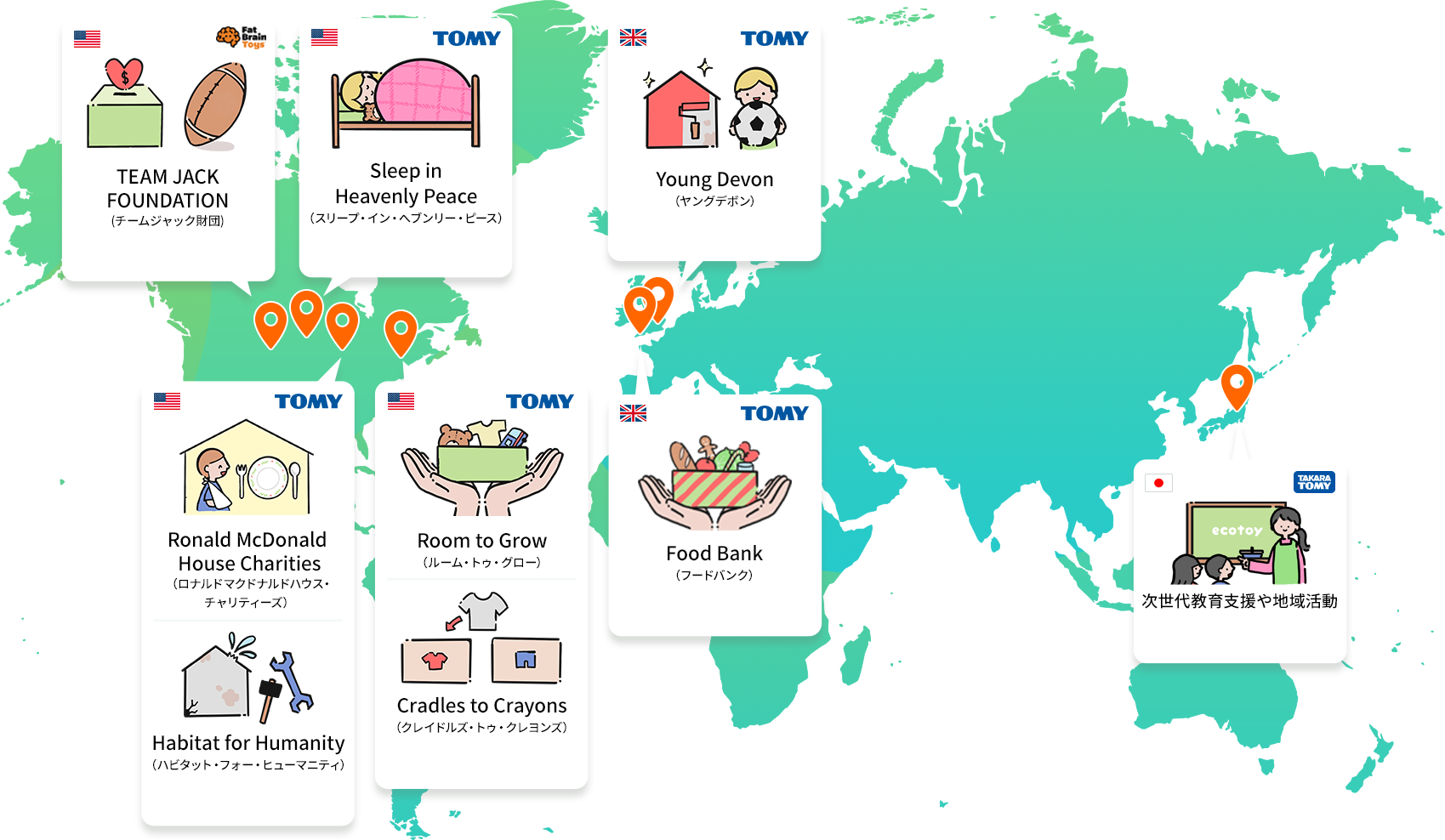 今回タカラトミーグループの世界各拠点で取り組んでいるボランティア活動や寄付などの社会貢献活動をご紹介しました。これらの活動は、支援を必要としている人たちを笑顔にするだけでなく、活動を行う私たち自身も笑顔になる機会を多くいただいています。これからも一人でも多くの世界中の子どもたちと友だちになれるよう、取り組みを進めてまいります。