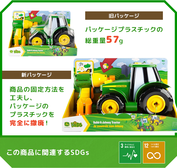 海外事業を担うTOMY International(トミーインターナショナル)では、ビルド・ア・ジョニー・トラクターのパッケージのプラスチックを2021年12月シリーズより完全撤廃しています。これは商品の固定方法を工夫したことにより実現し、2023年10月までの約2年間で、計25t以上のプラスチックの削減を見込んでいます。