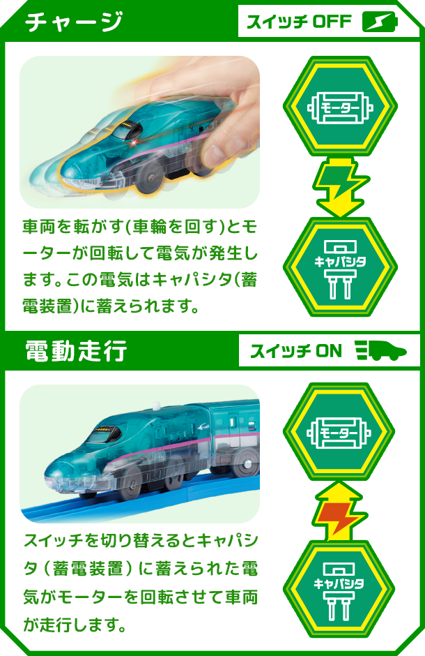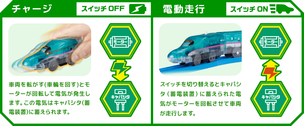 テコロでチャージは、プラレール史上初!※1 電池なし!での電動走行を実現しました。その秘密は、車体を前後に転がして車輪を回転させることで発電する“テコロチャージシステム”(特許出願中※2)!お子さま自らがエネルギーを作り出すことで、遊びながら学べ、さらに電池を使用せず繰り返し遊ぶことができます。