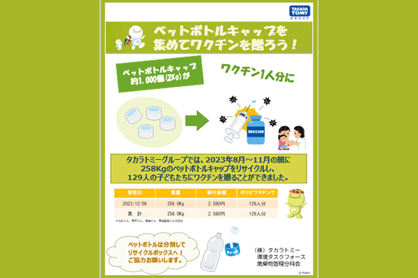 さらにタカラトミーのオフィスでは、ペットボトルキャップの回収量に応じて子どもたちにワクチンを寄付する活動に参加しています。ペットボトルを細かく分別するのはこの活動のためでもあります。キャップの回収は、2024年10月の回収時には275kgものペットボトルキャップが集まり、137.5人分のワクチンを寄付することができました。