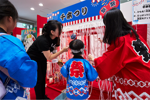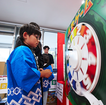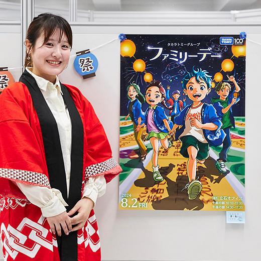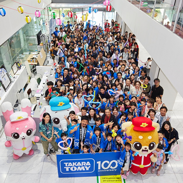 創業100周年を迎えた今年は、『100周年大感謝祭!!』がテーマ。これまで支えてくれた社員の皆さんと、社員を支えてくれているご家族の皆さんに、特大の感謝の気持ちを込めて、お祭りをイメージした装飾を施したオフィスで、タカラトミーグループのたくさんの“アソビ”を体験できるプログラムを用意しました!