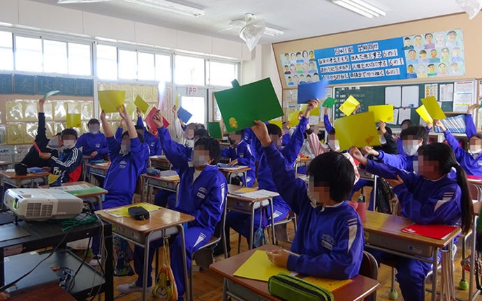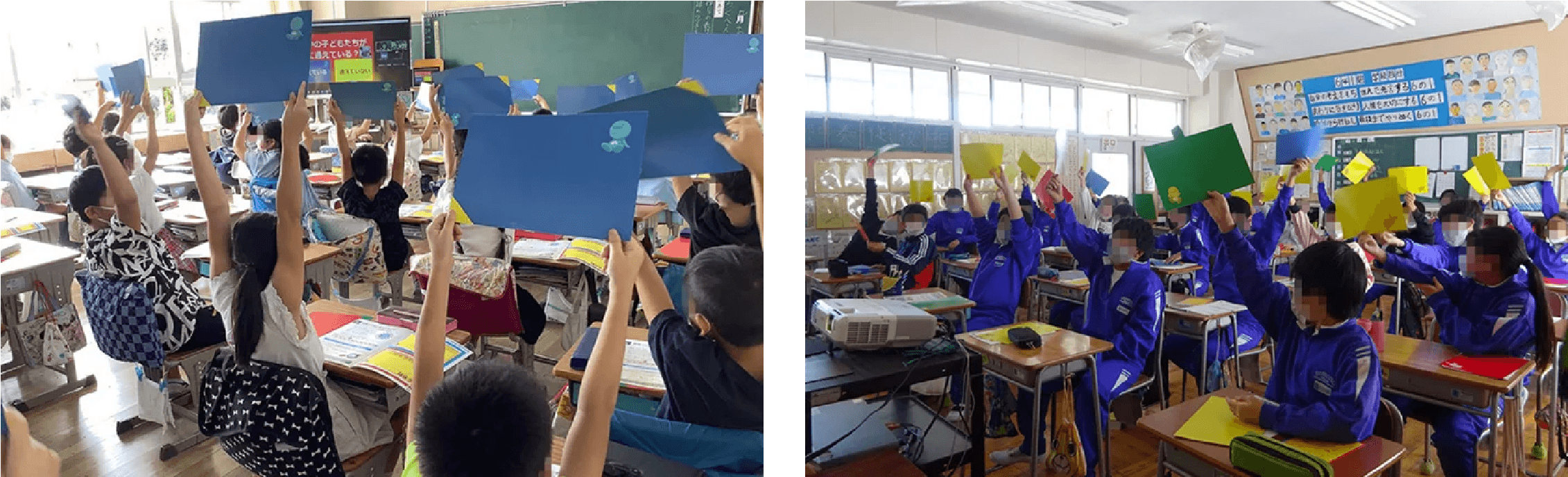 「一人ひとりの考えに寄り添うことの出来る授業を実施したい。」そんな想いからリアクションカラーカードは生まれました。意見を言うのが得意な子も苦手な子も自分の気持ちを伝えることのできる喜びを感じてもらえるよう、カードを上げて自分の考えを伝えてもらっています。