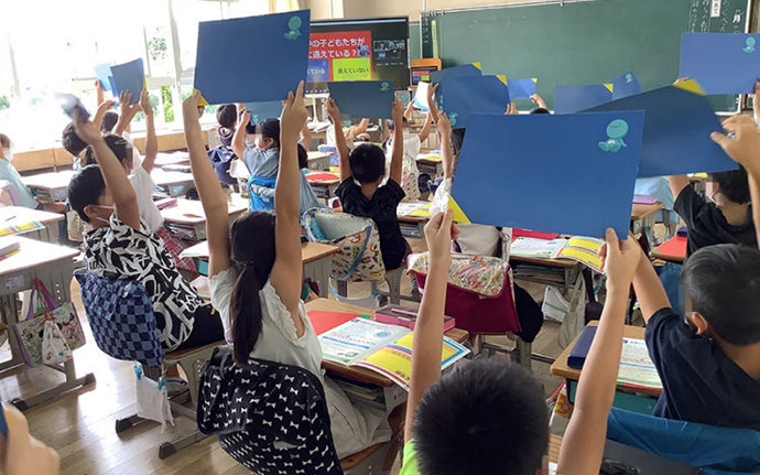 子どもたちが「自分のこと」として社会課題を考えられるよう、授業は終始“参加型”で展開しています。クイズや紙芝居のようなストーリー展開を通して、子どもたちが想像力を働かせ、考えをめぐらし楽しみながら学べる授業展開となっています。
