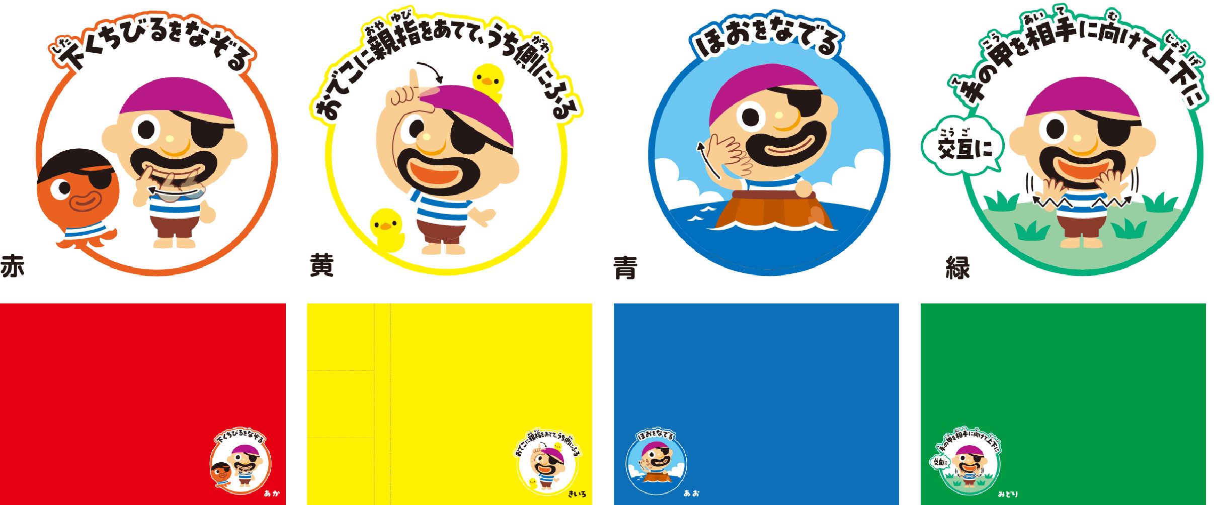 黒ひげが色を手話で表現するイラストで手話やユニバーサルデザインに触れるきっかけを作ります。