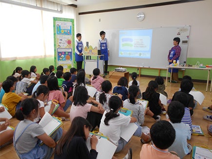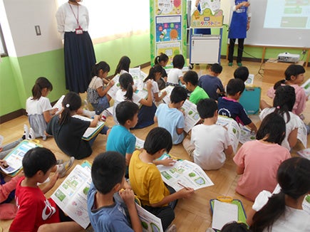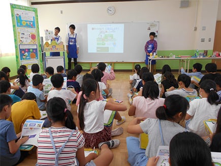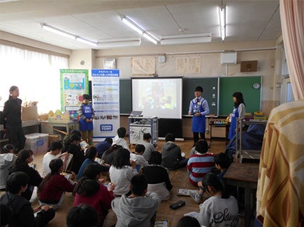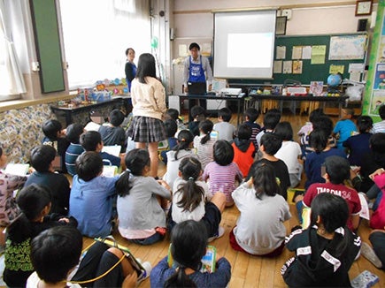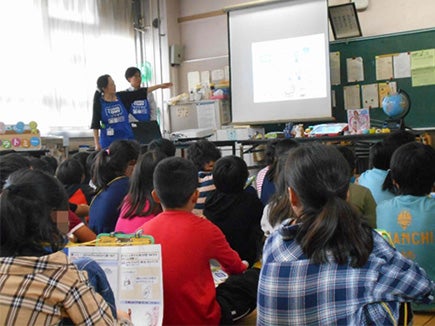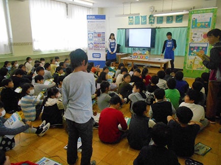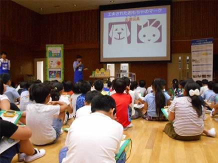 当日は4年生2クラス69名の生徒の皆さんに、「共遊玩具」、「環境に配慮した玩具の工夫」、「玩具の安全性」という3つのテーマについて勉強してもらいました。