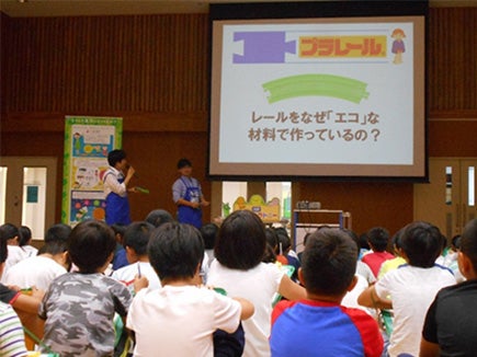 環境活動については、リサイクルされた原料が配合されているプラレールのレール「エコレール」を題材に、環境に配慮された玩具について学習しました。クイズを通じてエコトイの環境にやさしい工夫を学んでもらい、大いに盛り上がりました。