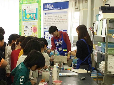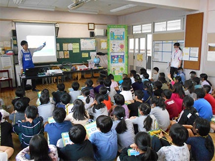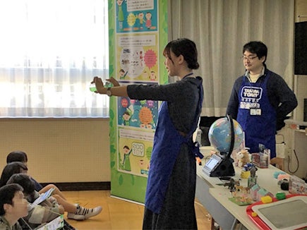 当日は5年生2クラス64名の生徒の皆さんに、「環境に配慮した玩具の工夫」と「共遊玩具」という2つのテーマについて勉強してもらいました。