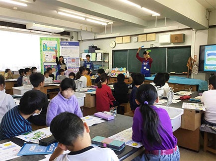 当日は5年生2クラス62名の児童の皆さんに、「共遊玩具」と「環境に配慮した玩具の工夫」という2つのテーマについて学習してもらいました。