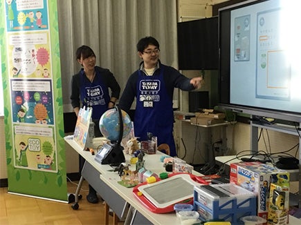 「環境に配慮した玩具の工夫」のパートでは、将来枯渇する資源の問題について授業を行いました。その中ではおもちゃの多くはプラスチックでできていてその原料は石油であることを伝えようとしたところ、答えを言う前に児童の皆さんから答えが出てきたり、材料消費を少なくする方法を伝えるときにはリサイクルの単語が真っ先に出てきたり、他の授業で学んできたことを今回の授業につなげて「あの時の勉強がおもちゃにつながっているんだ!」と驚く等とても積極的な学びが見られました。児童の皆さんにとって普段から遊ぶおもちゃに繋がる問題でもあるため、とても興味をもってエコ活動を行う大切さを感じてもらえたように思いました。