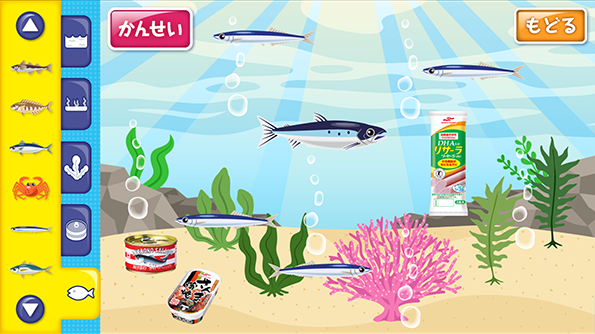 「マルハニチロのすいぞくかんをつくろう!」では、魚や缶詰、かざりのパーツを組み合わせて自分だけの水族館を作ることができます。