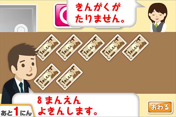 来店するお客様の希望に合わせてサービスを案内する、お金を数える、口座を作るなどのお仕事を体験できます。