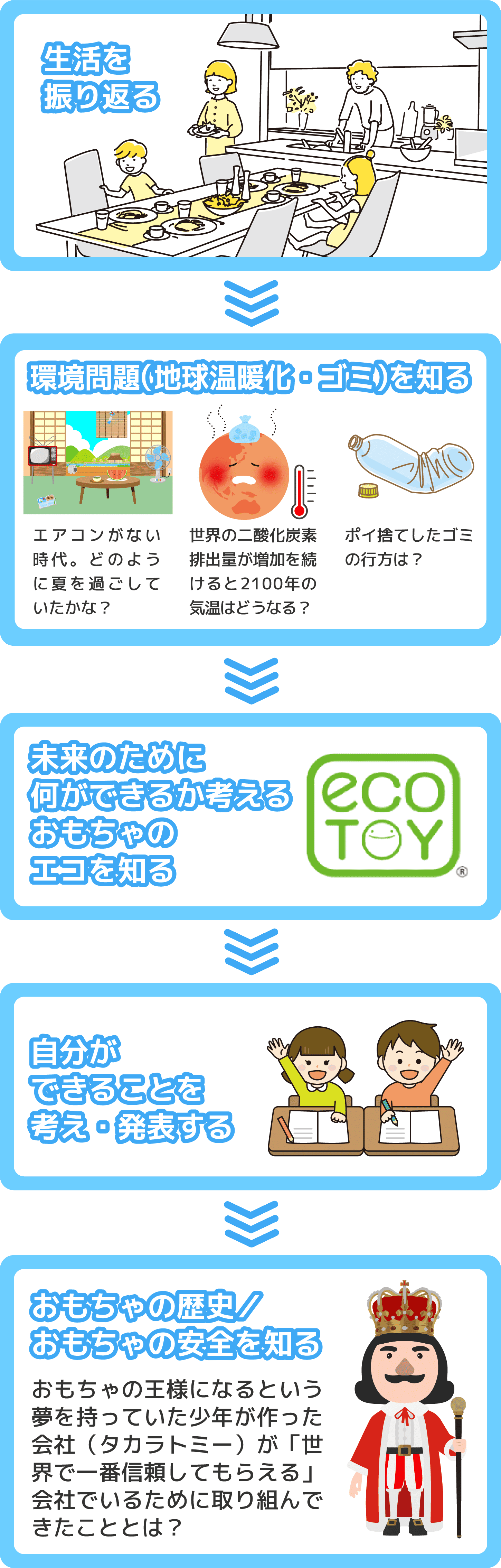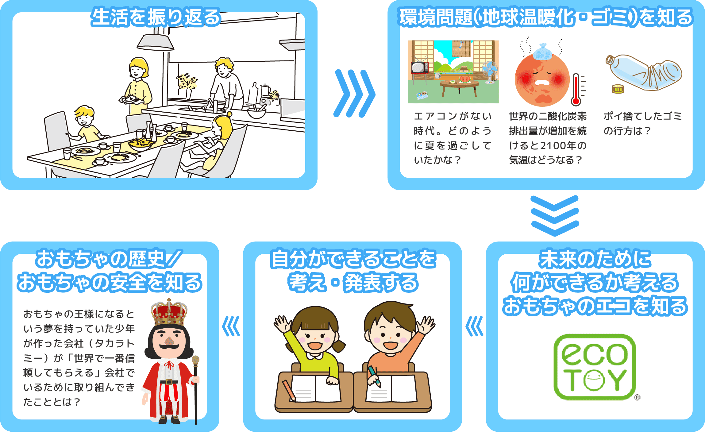 この授業では、エコトイやタカラトミーグループの環境に関する活動を通じて、環境問題を自分事として考え、地域に貢献しようとする心を育て、考えたことを行動することを促します。