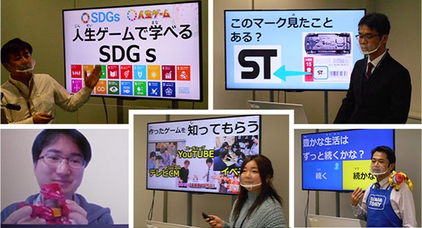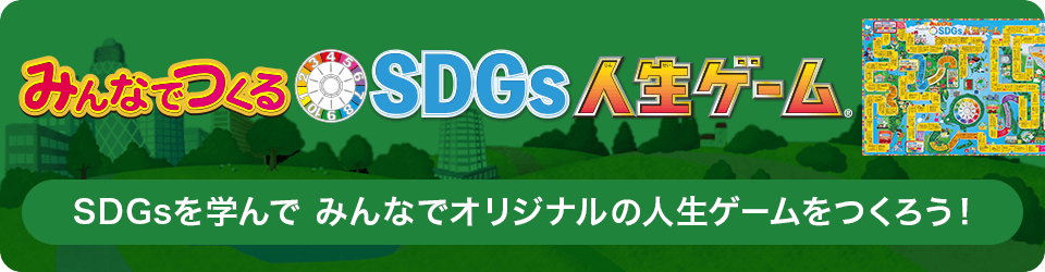 授業で配布している「タカラトミーグループ SDGs人生ゲーム」ポスターでおうちの人や地域の人と一緒に遊んで、大人も一緒にSDGsを学びましょう。 -