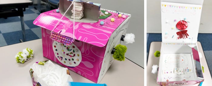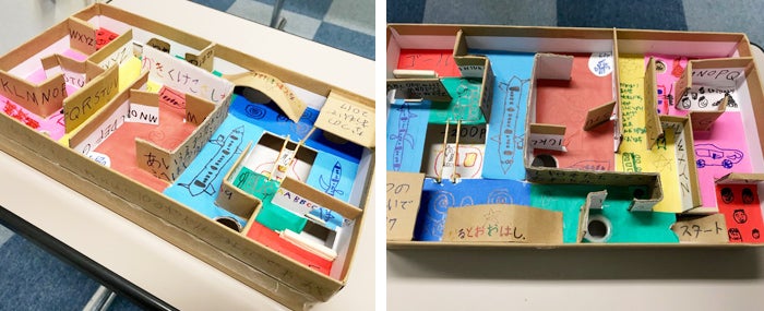 空き箱を使った『エコトイ』には、楽しい仕掛けも満載!将来有望なおもちゃ開発者ですね。