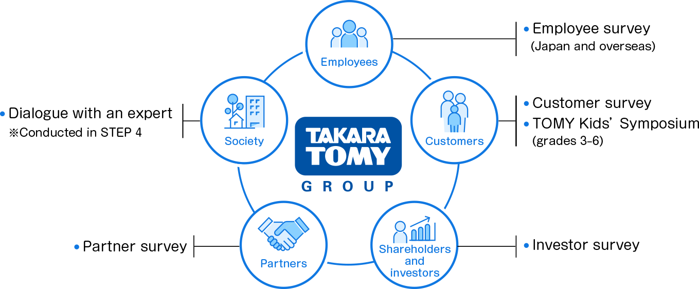 For the 24 candidates selected, we interviewed and surveyed customers, employees, shareholders and investors, and partners. We also held a “TOMY Kids’ Symposium” to provide an opportunity for employees and children to exchange opinions on an equal footing, as well as to explore insights into how the Group can make unique contributions.