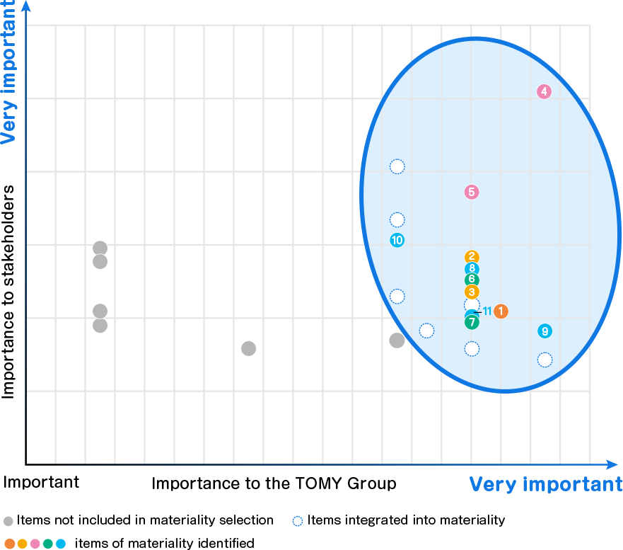 To fulfill its Sustainability Vision—A creator of quality Asobi that promotes the sustainable well-being of society—the TOMY Group has reviewed its materialities (material issues) through fiscal 2023. To realize both a sustainable society and growth for the Group, we established five new pillars related to “Our Passions” and “Our Responsibilities” and identified 11 materialities as key sustainability issues.