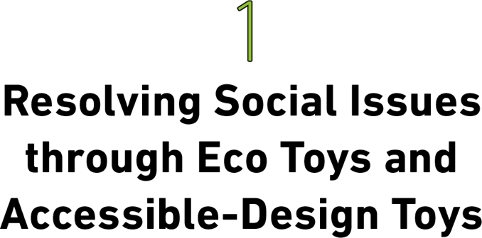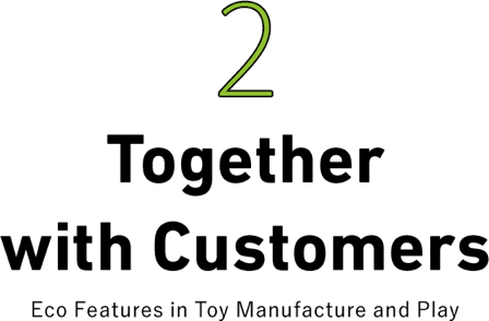The Eco Toy mark indicates toys that fulfill the TOMY Group’s environmental standards. The Group-wide Eco-Toy Committee sought independent advice to help determine eight specific Eco Toy standards. A toy that meets one or more of those criteria can display the Eco Toy mark on its packaging as an effective way of teaching customers about environment-conscious toy features.