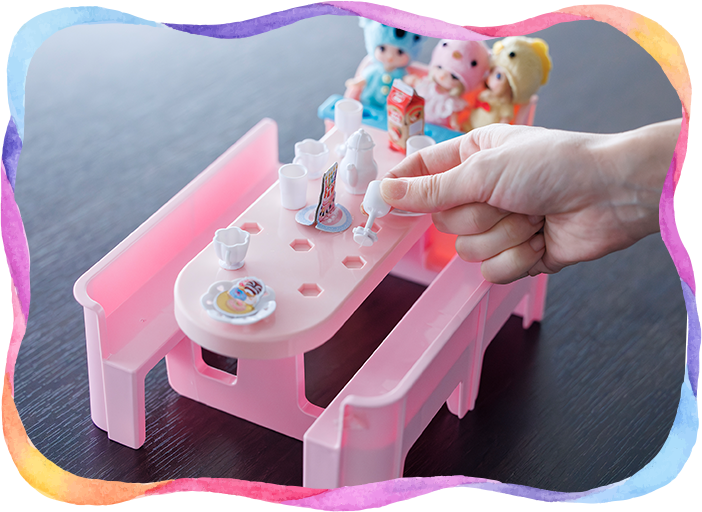 One innovation was to introduce accessories that could be fixed in place using the series’ standard-sized protrusions and holes. In the LICCA House Series, launched in 2023, La maison with LICCA Swing Set and Slide included a dining table with holes on the tabletop and dishes, cups, etc. with protrusions on the bottom to fit into the holes. The small items could be placed securely on the dining table using the protrusions and holes, preventing them from being dropped or lost while playing.