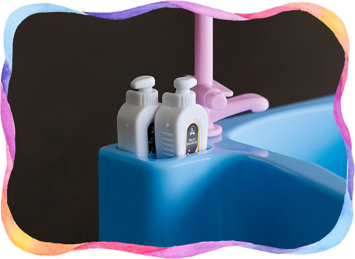 Ridges are formed on the side of the shampoo bottle only (front of picture). This slight surface roughness plays a valuable role in expanding the toy’s play possibilities.