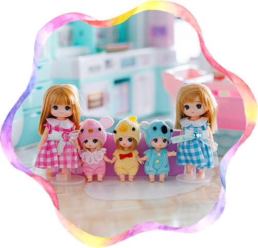 LICCA’s little sisters are one set of twins and one set of triplets. All are identical in form and size. The twins Maki-chan and Miki-chan can be told apart by the parting of their bangs, while the triplets Kako-chan, Gen-kun, and Miku-chan can be distinguished by the edges of their hats.