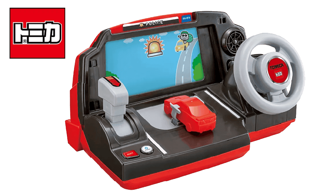 A steering wheel toy that allows for various driving experiences with your favorite “TOMICA”