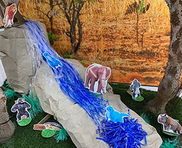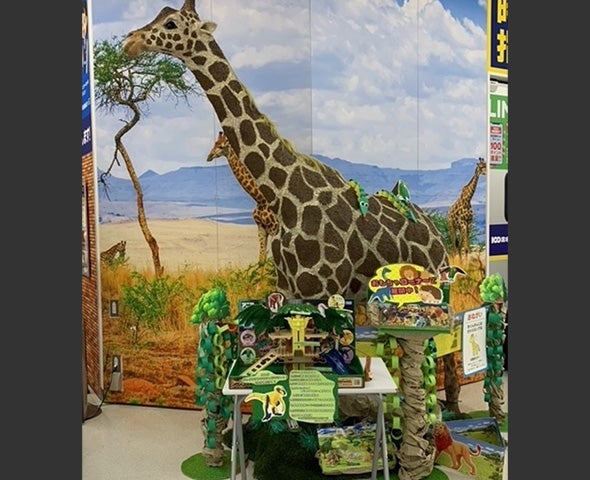 エスカレーターから続く足跡をたどれば、、、そこはサバンナ!おおきなキリンがおでむかえするおもちゃサンプルコーナーで、大自然を感じながらアニアを遊べる迫力にやられました!岩場にはアニアキングダムの動物がたくさん!