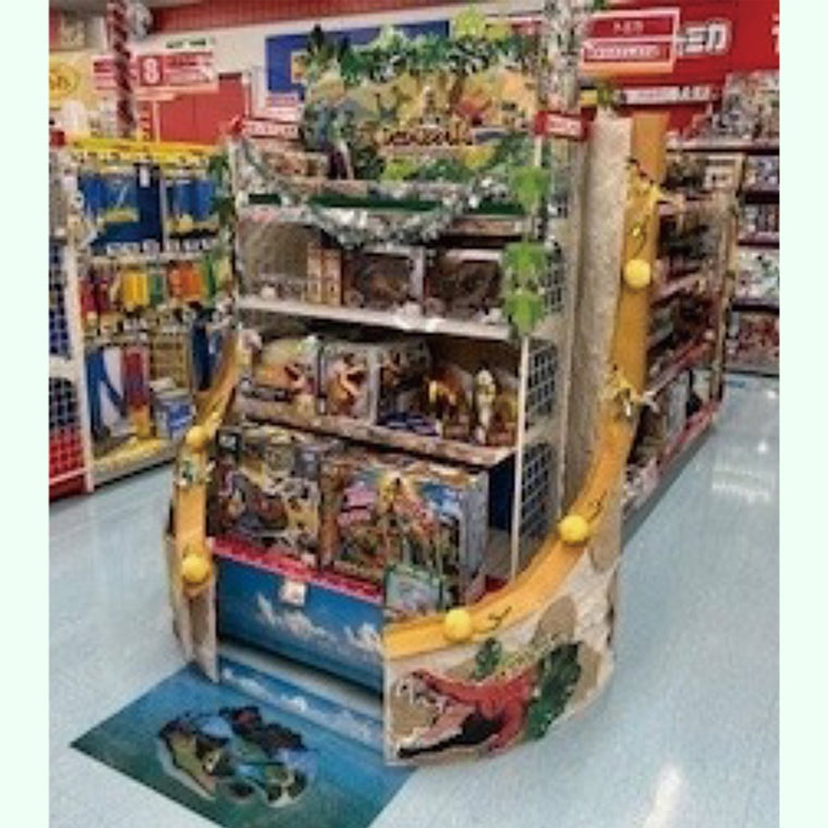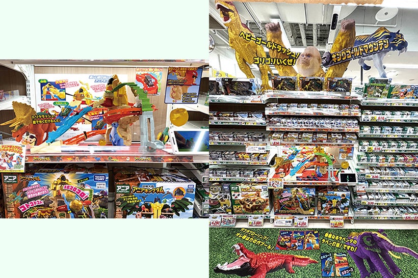 棚から飛び出すゴルド達のパネルが大迫力!まるでジャングルの様な床にもキャラクター達がたくさん!キングゴールドマウンテンがライトで照らされているので手元が明るくなり子どもたちが遊びやすいのもGOOD!空間を広く使って表現するだけでなく、細かい部分まで配慮された売場でした。グランプリ受賞おめでとうございます!