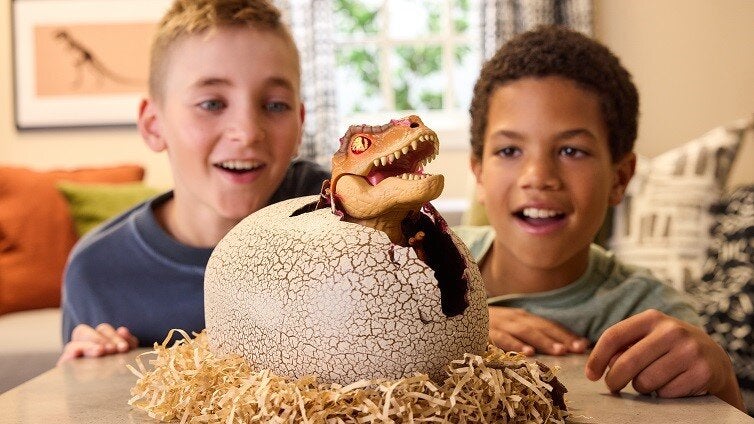 A dinosaur egg really hatches. A T-Rex emerges from it!