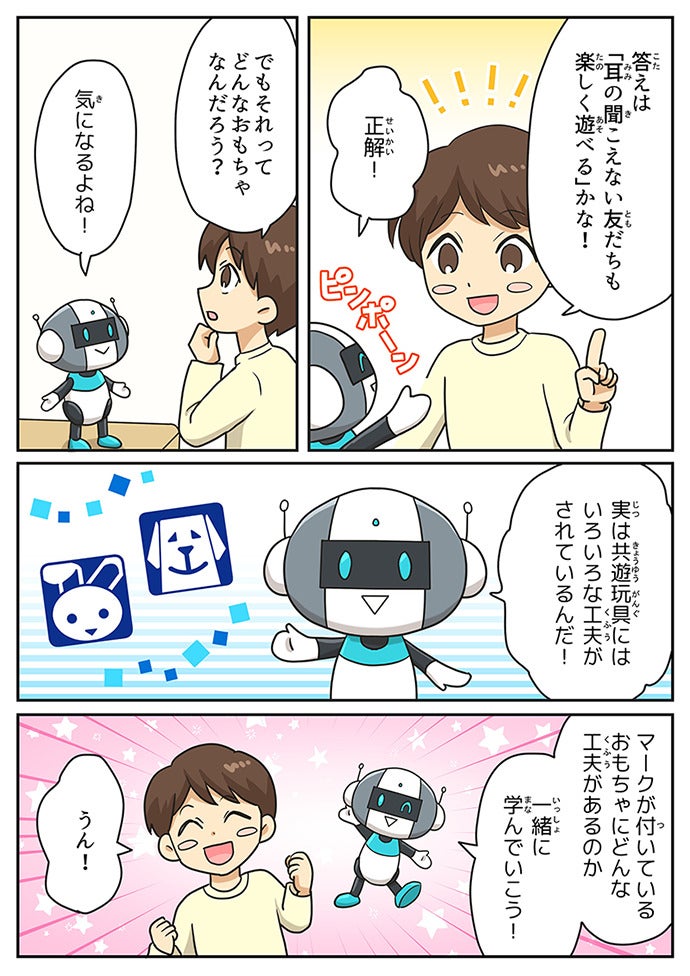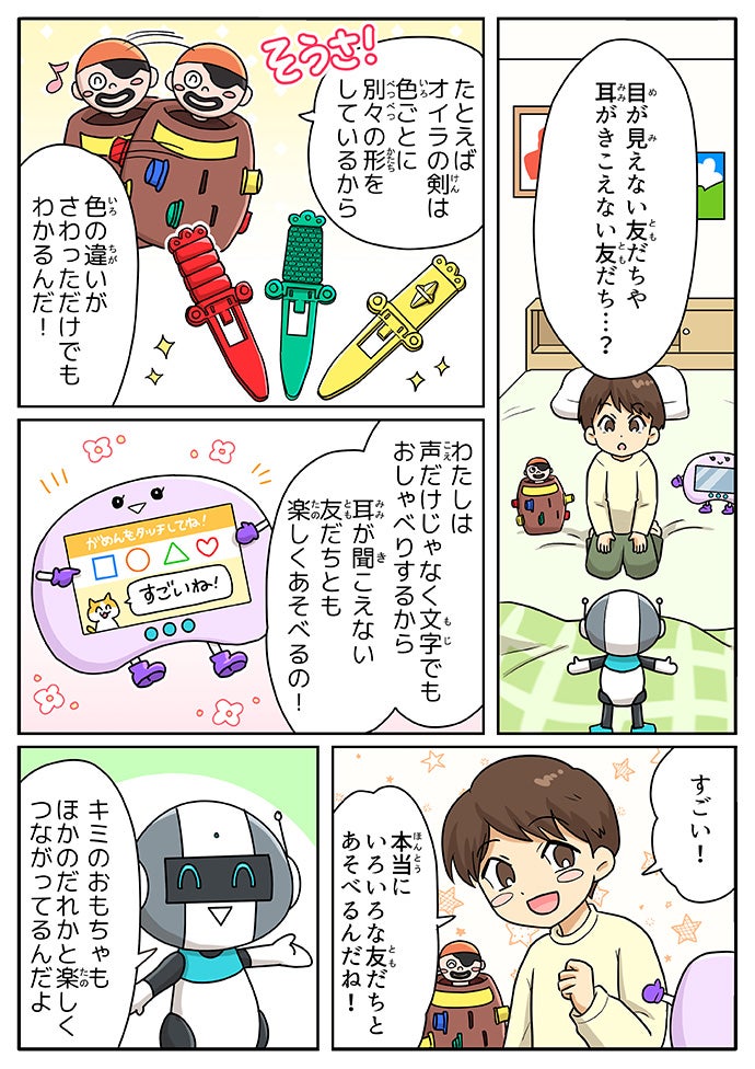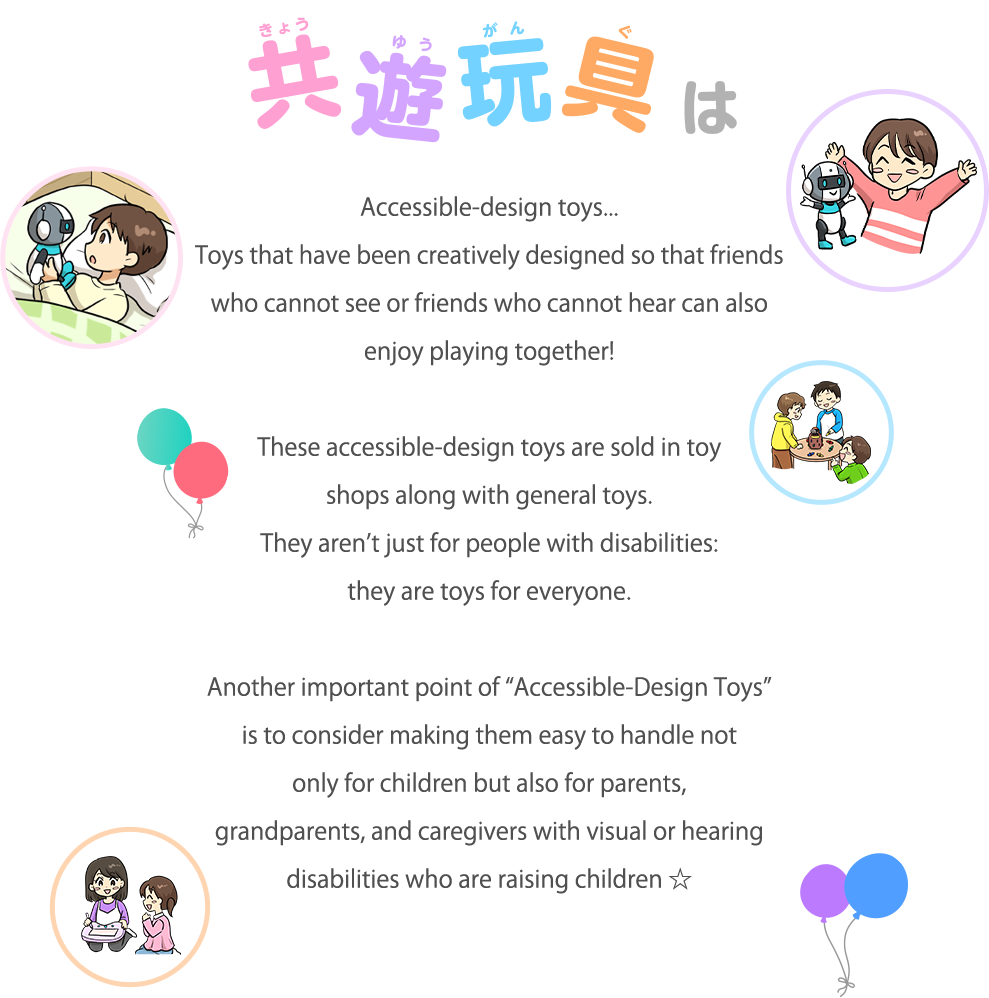 Toys that you can enjoy playing with together with friends who have visual or hearing disabilities are described as “toys for playing together” and known as “Accessible-Design Toys”!