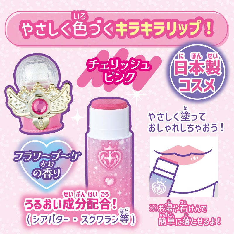 やさしく色づくオレンジピンク色のクリームチーク、チェリッシュピンク色でフラワーブーケの香りのリップはキラキラのラメ入り。