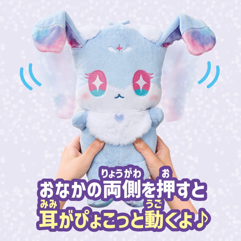 フォーチュのおなかの両側を押すと、耳がぴょこっと動きます。 アイプリのグッズを入れて、いつでも一緒におでかけでき、ぬいぐるみ、ポシェットの2通りで楽しめます。