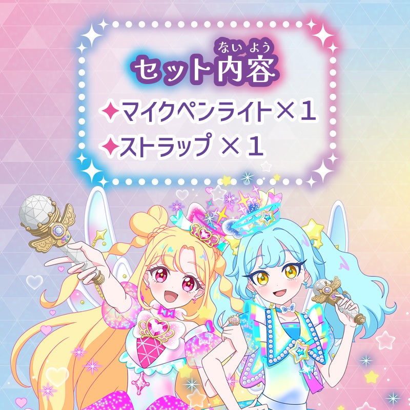アニメやゲームでアイプリのライブ中に登場するマイクがモチーフのペンライト。 おそろいのマイクで、アイプリになりきることができます。 マイクはカラー8色+オリジナルカラー1色を光らせて楽しむことができます。