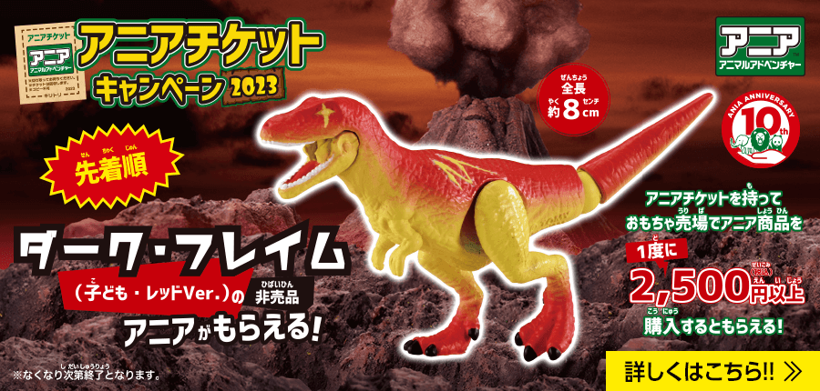 アニアどうぶつおえかきコンテスト 2023冬 2023.12.15 キャンペーン期間 2023年12月15日(金)~2024年1月8日(月) ※応募の受付は終了しました。 ページトップへ アニア ゴールドライオン(ワイルドVer.)がもらえるキャンペーン 2023.11.02 ※キャンペーンは終了しました。 ページトップへ ハッピーアニアNEO 恐竜おえかきコンテスト!結果発表 2023.08.09 ページトップへ たのしいアニアのおみせコンテスト 結果発表! 2023.07.20 ページトップへ 福井県立恐竜博物館にアニアスペシャルブースが期間限定でオープン! 2023.07.14 開催期間 2023年7月14日(金)~8月31日(木) 開催場所 福井県立恐竜博物館 3階 ページトップへ アニアチケット キャンペーン2023 2023.07.07 キャンペーン期間 2023年7月15日(土)より開催予定 ページトップへ ハッピーアニアNEO恐竜 おえかきコンテスト 2023.07.07 キャンペーン期間 2023年7月14日(金)~2023年7月31日(月) ※キャンペーンは終了しました。 受賞作品の発表はこちらから! ページトップへ トミカ博 in OSAKA・プラレール博 in TOKYOでアニアキングダムのジオラマ展示中! 2023.04.27 ページトップへ スペシャルステッカー付き! アニアおたのしみDVD2023わくわくセット 2023.03.16 キャンペーン期間 2023年3月23日(木)より開催予定 ページトップへ 過去のキャンペーン(2024年) 過去のキャンペーン(2023年) 過去のキャンペーン(2022年) 過去のキャンペーン(2021年) 過去のキャンペーン(2020年) 過去のキャンペーン(2019年) 過去のキャンペーン(2018年) 過去のキャンペーン(2017年) ツイート