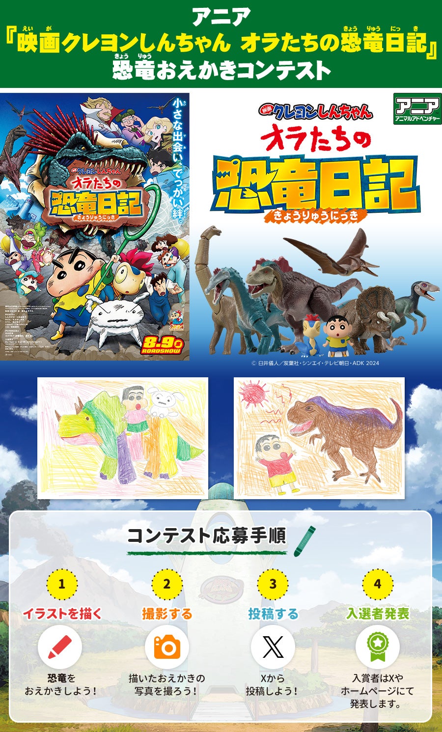 - イラストを添付、作品名記載のうえ、ハッシュタグ「#映画クレヨンしんちゃんアニア」をつけてポスト(Xへの投稿)をしてください