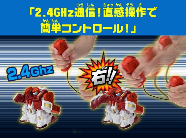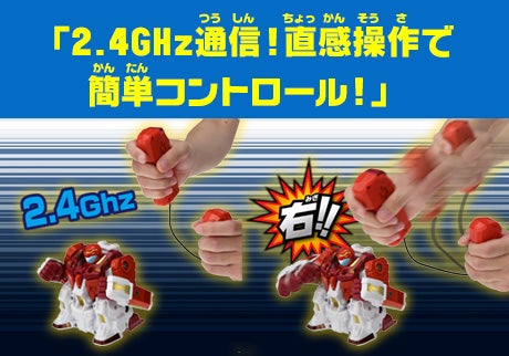 コントローラーと機体が2.4Ghzで通信することで一体感の高い操作性が実現!右手を振れば右パンチ!左手を振れば左パンチ!機体の動きに合わせて前進。直感操作で相手をブッ飛ばせ!