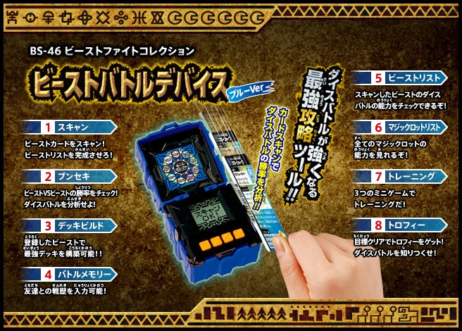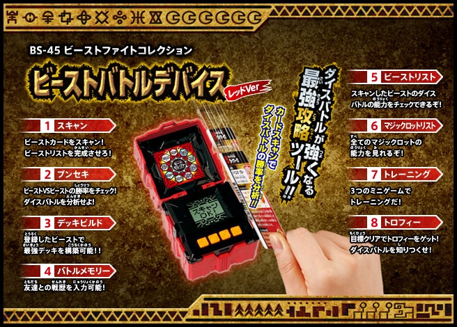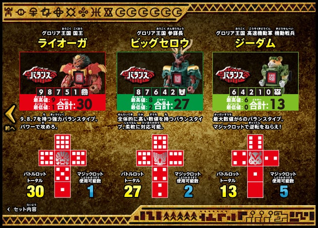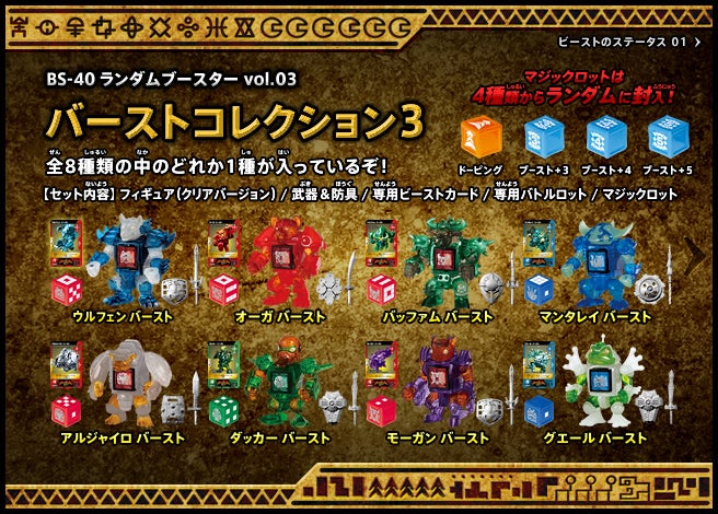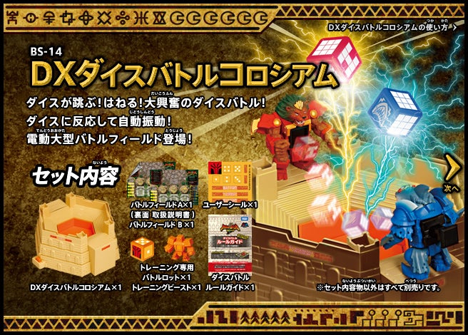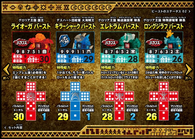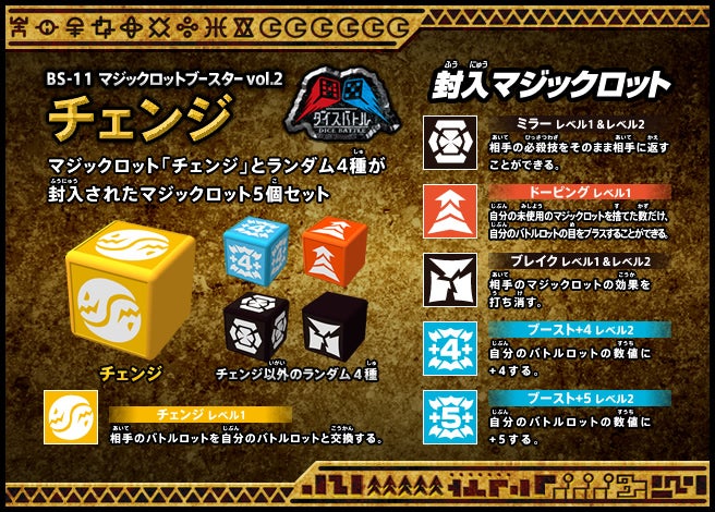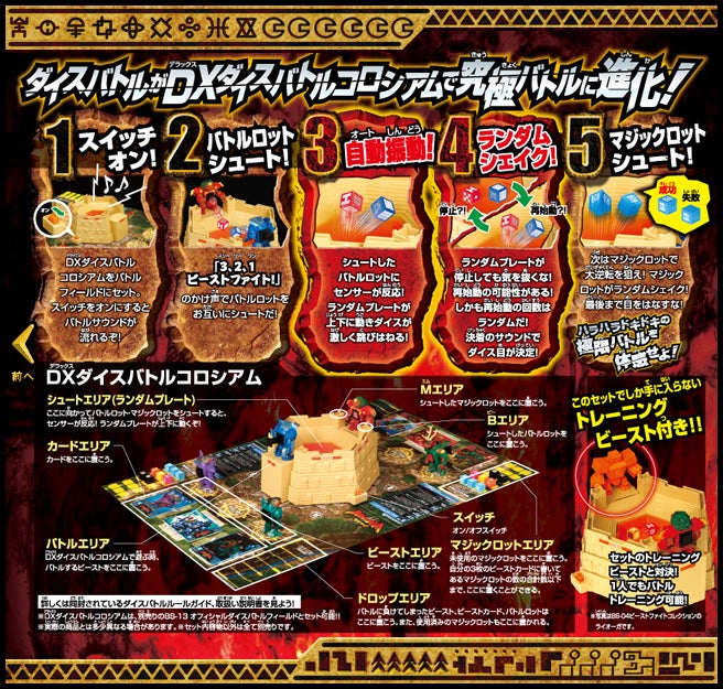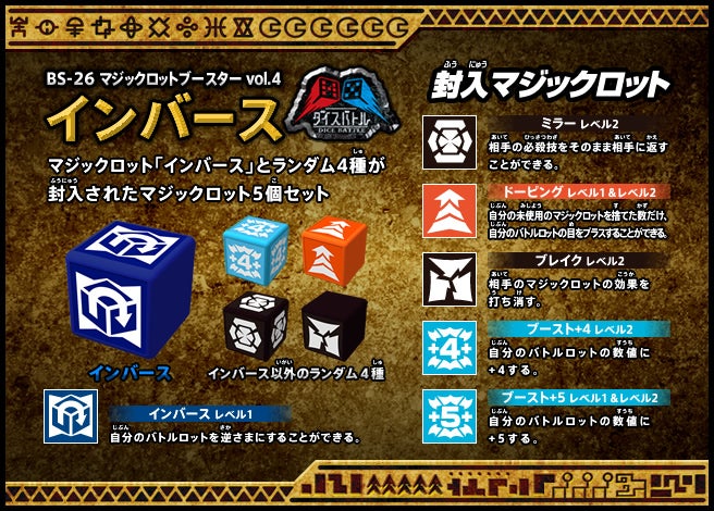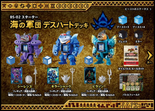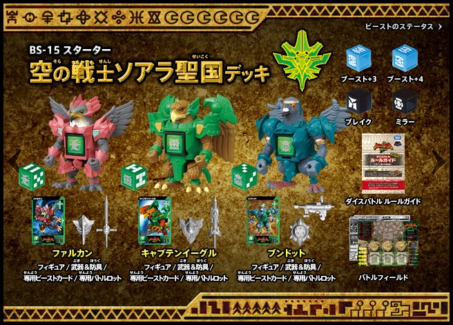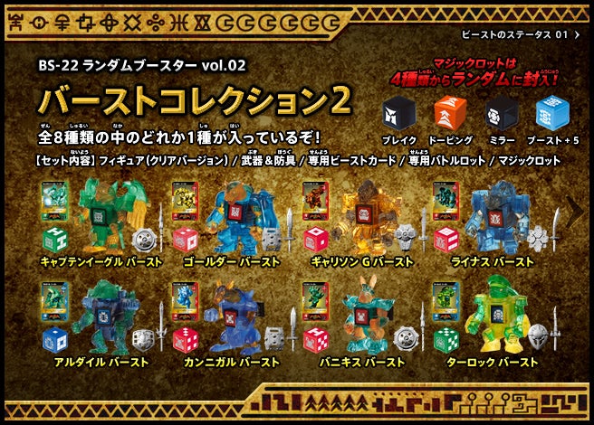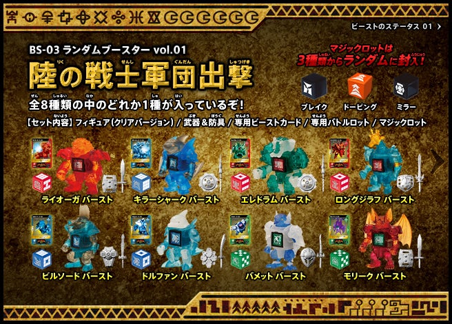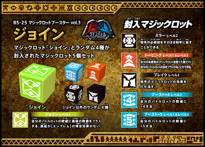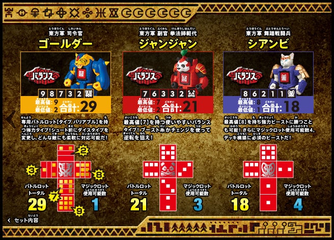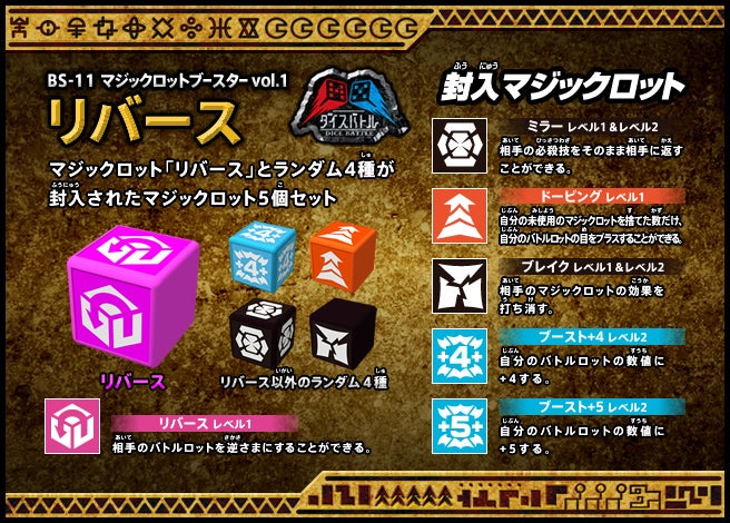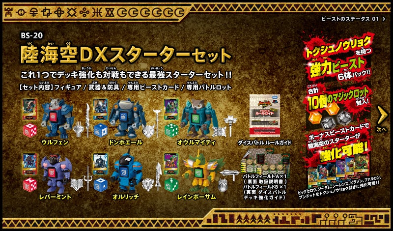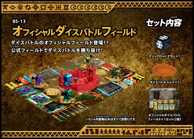 すぐバトルを始(はじ)めることができるスターター、種類(しゅるい)が選(えら)べるブースター、デッキを強化(きょうか)できるランダムブースター、さらに強化(きょうか)アイテムやセットなど、ダイスバトルに必要(ひつよう)な最新(さいしん)ラインナップだ!