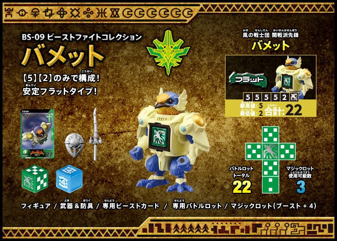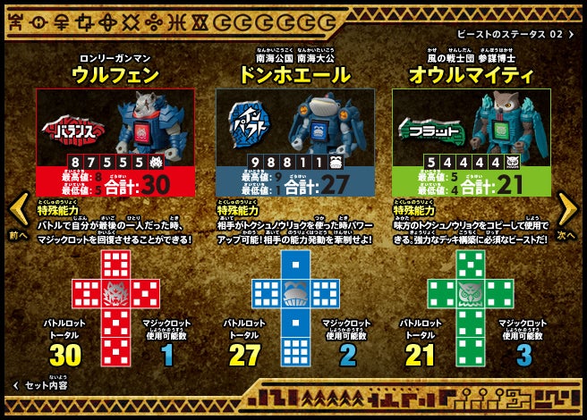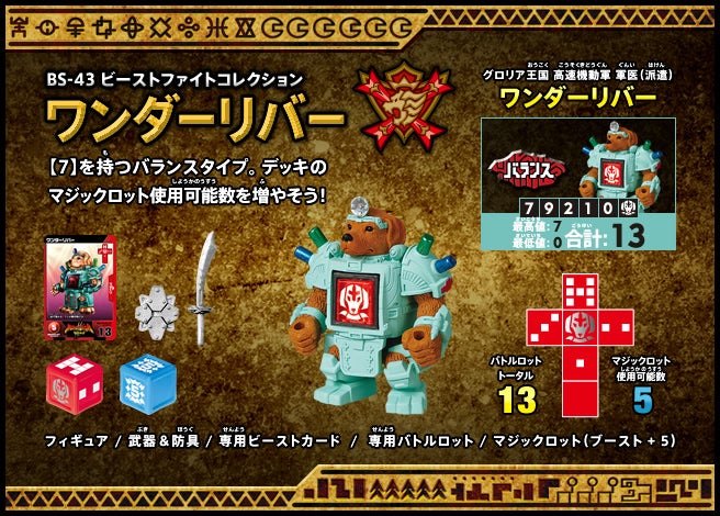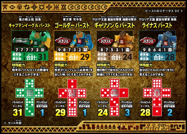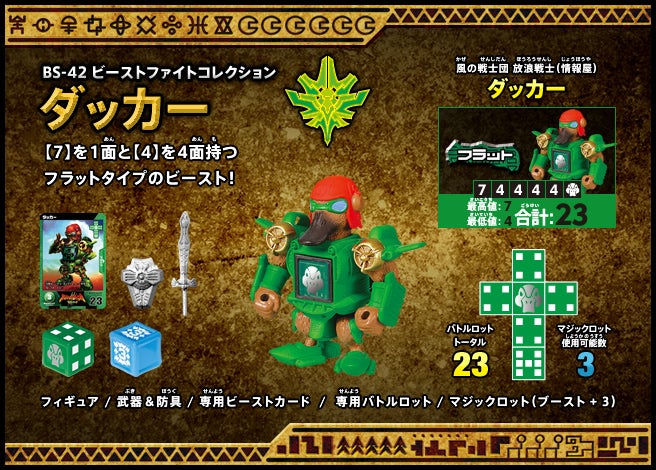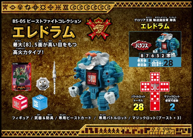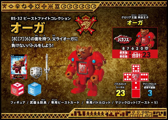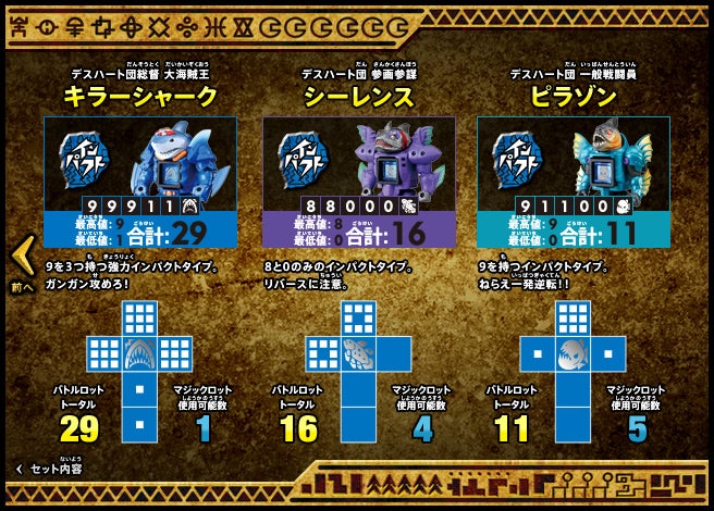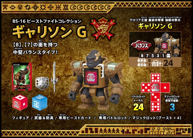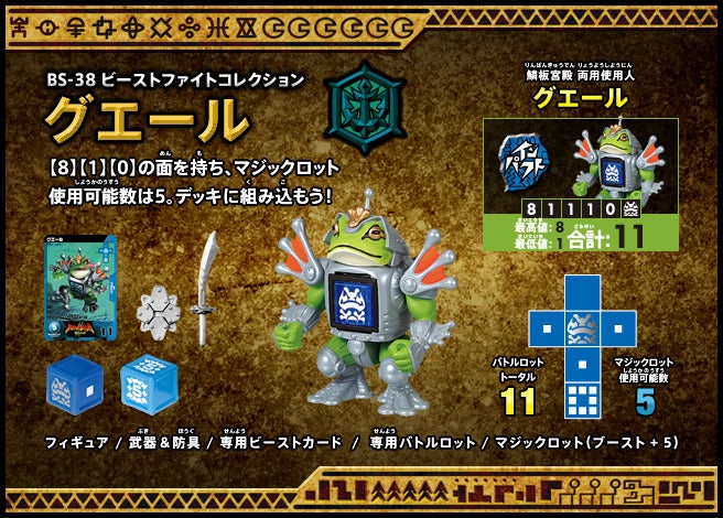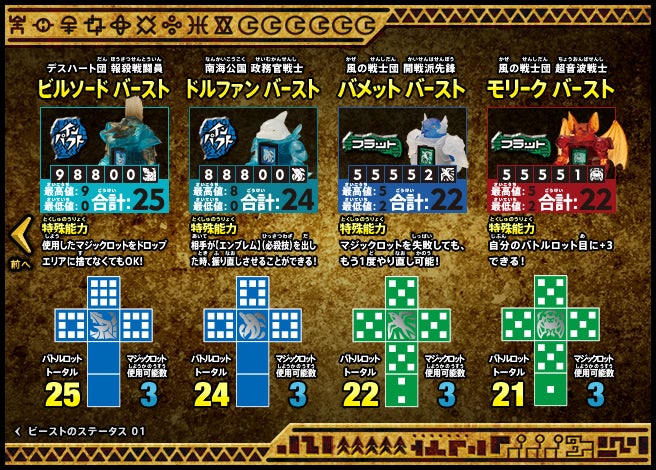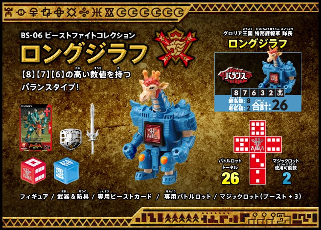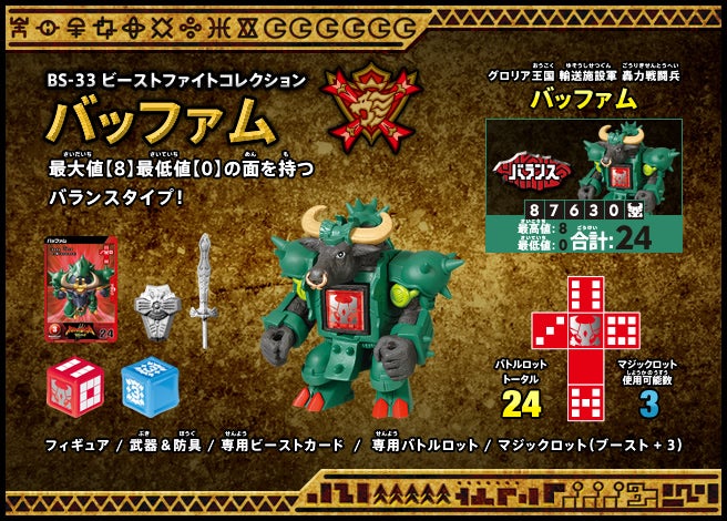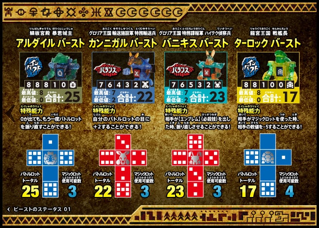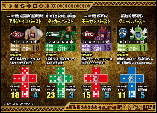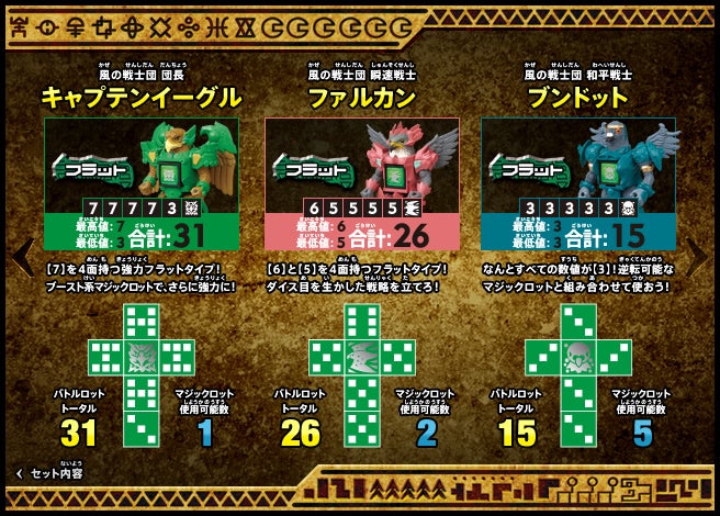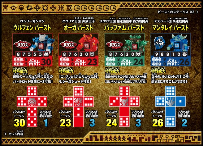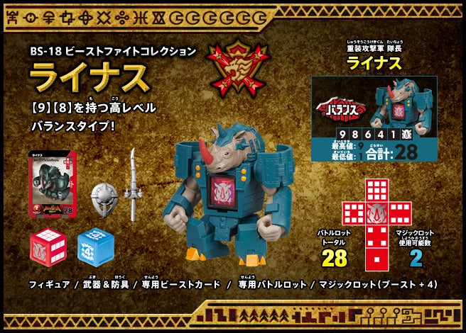 すぐバトルを始(はじ)めることができるスターター、種類(しゅるい)が選(えら)べるブースター、デッキを強化(きょうか)できるランダムブースター、さらに強化(きょうか)アイテムやセットなど、ダイスバトルに必要(ひつよう)な最新(さいしん)ラインナップだ!